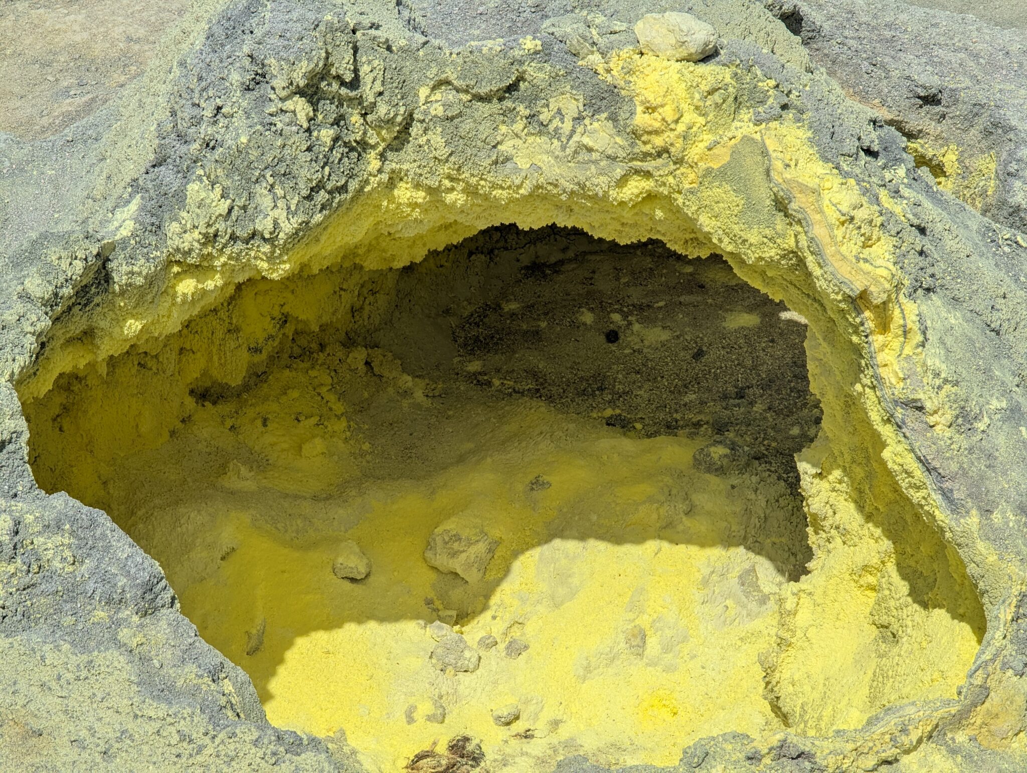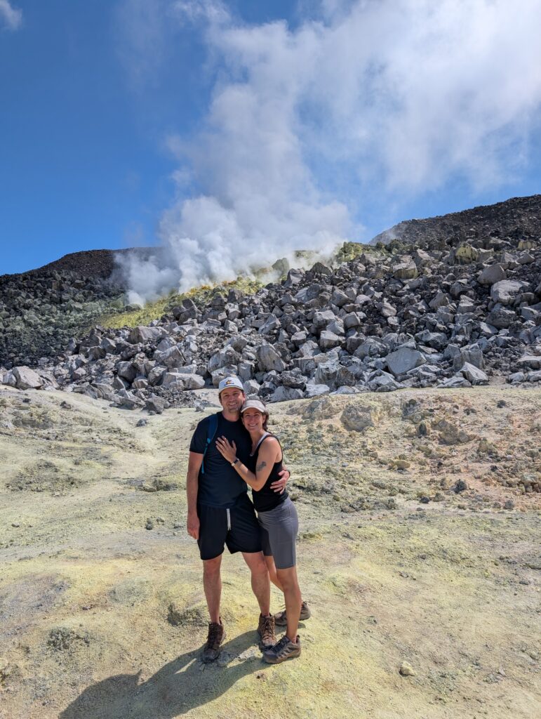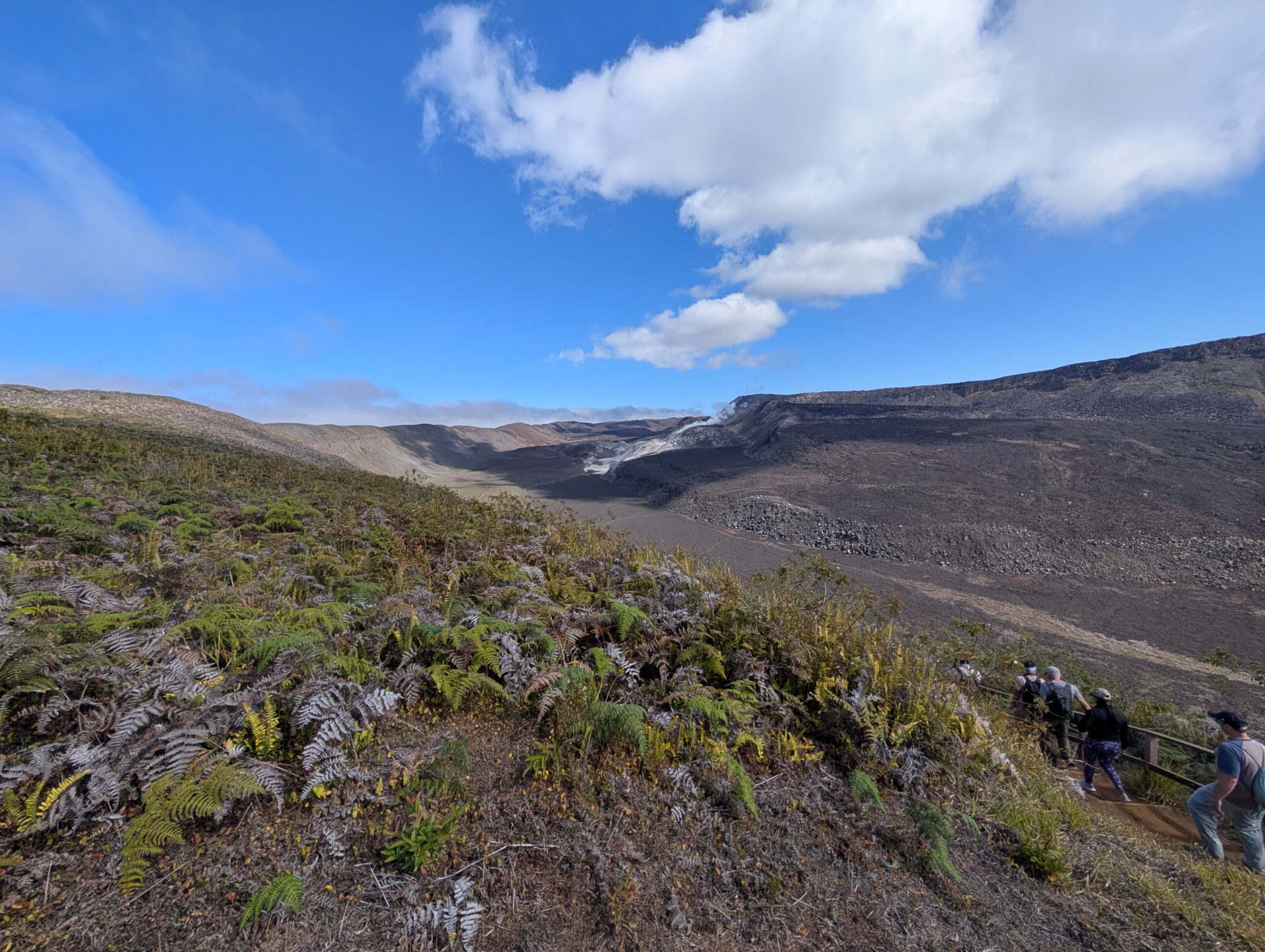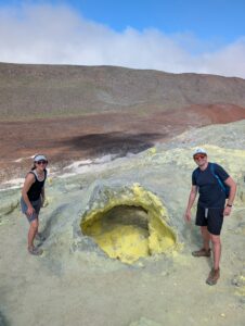 Our final day of excursions started with the shorter hike to the Sierra Negra caldera, which is one of the largest active calderas at nearly 10 km diameter. We walked into the caldera and the sulphur mines, where there were some pockets where you could hold your hand over and feel the heat radiating (surely just fine for our health to be radiated for a second). Inside the vents, it is about 300 degrees Celsius (~575 Fahrenheit). We could also see the sulfur gas coming out of the largest vent (from a safe distance, of course).