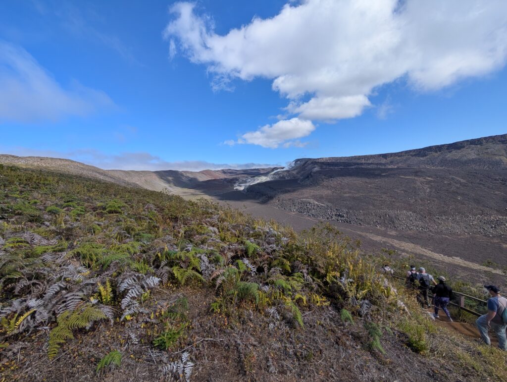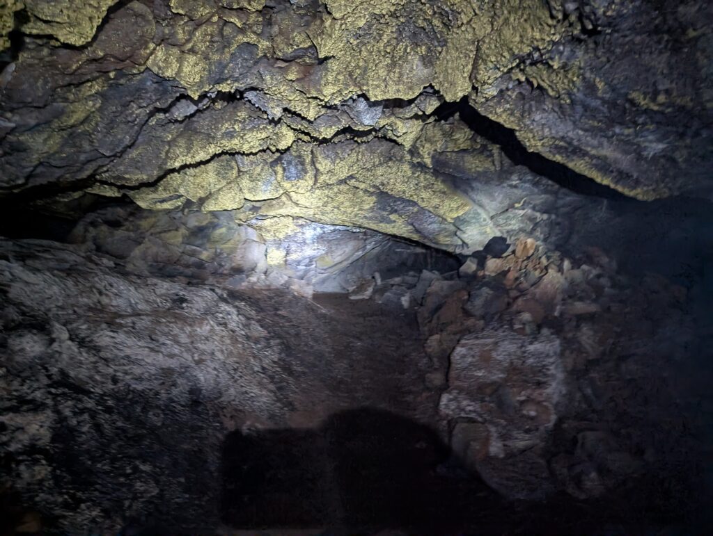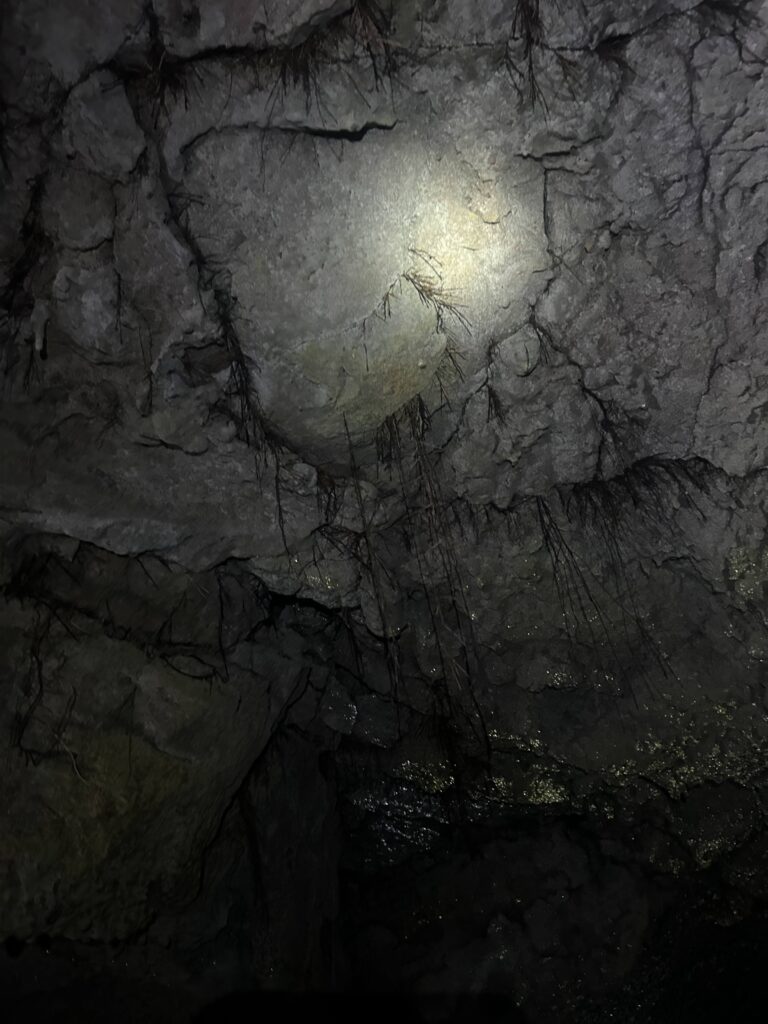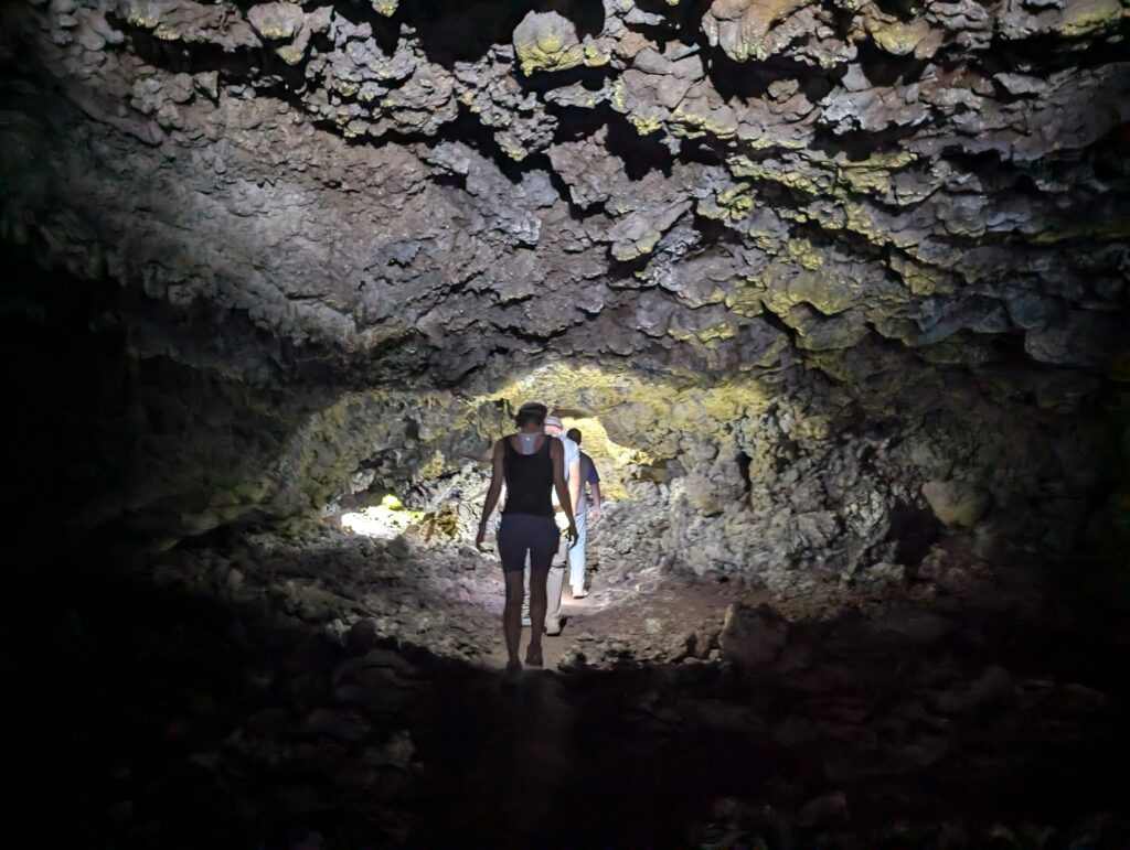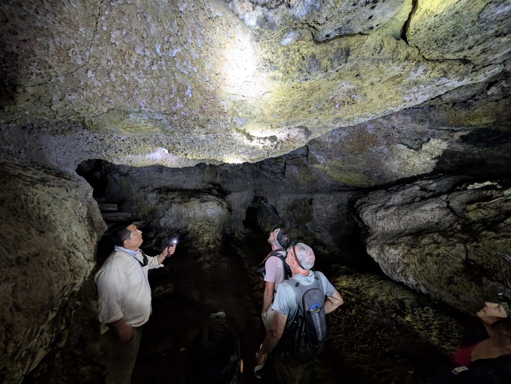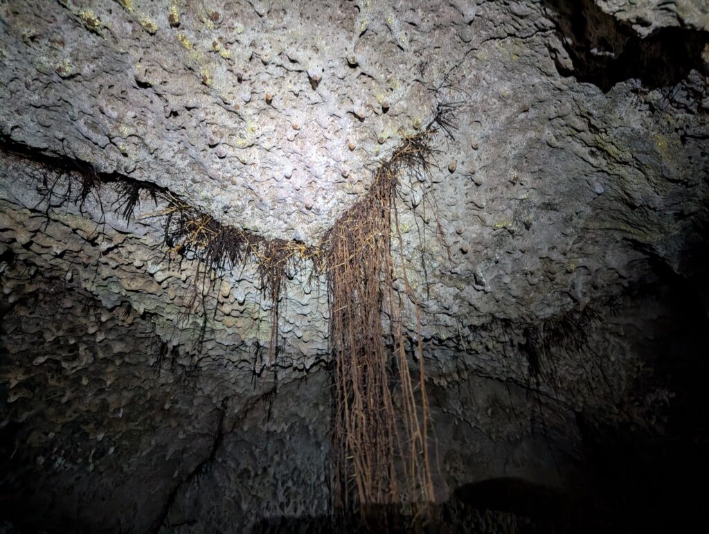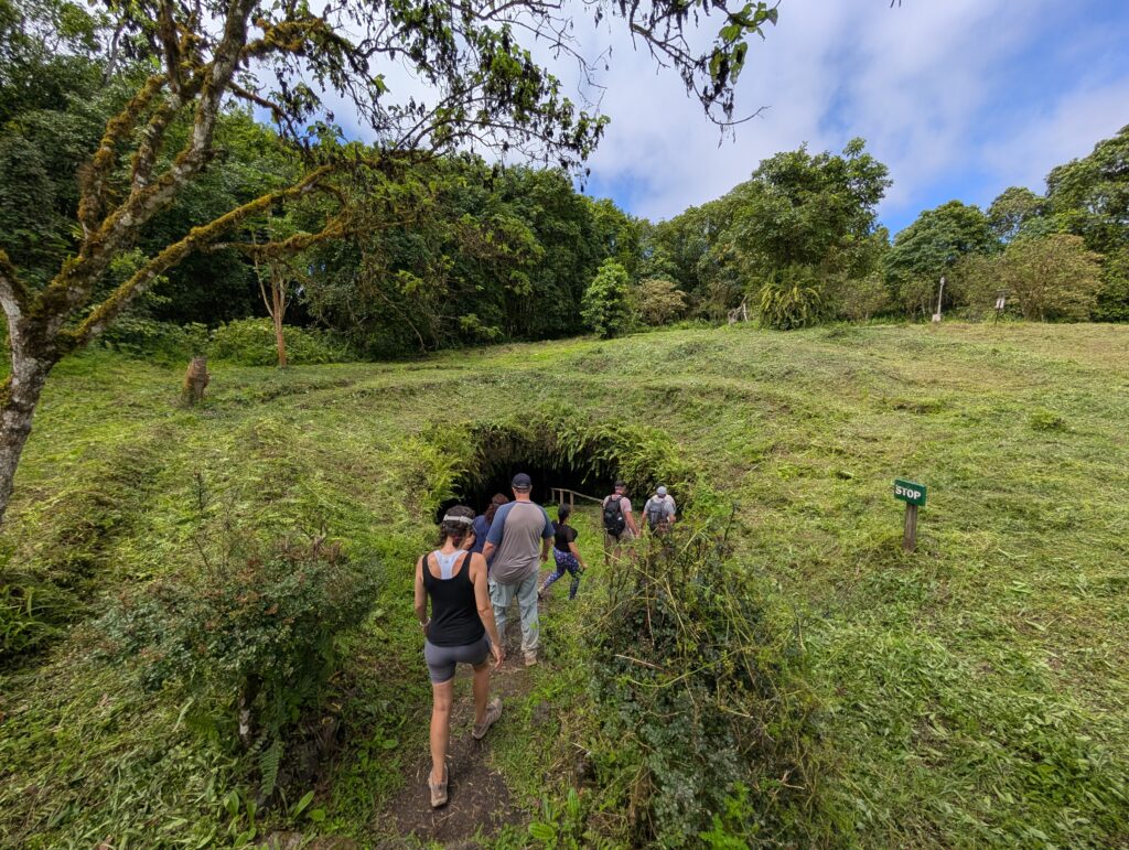 We visited a lava cave, formed by flowing magma from an eruption, after seeing the caldera. The cave was surrounded by avocado trees, which are invasive to the area and are in the process of being removed and replaced with native species. We could see the roots of the avocado trees growing into the cave.