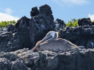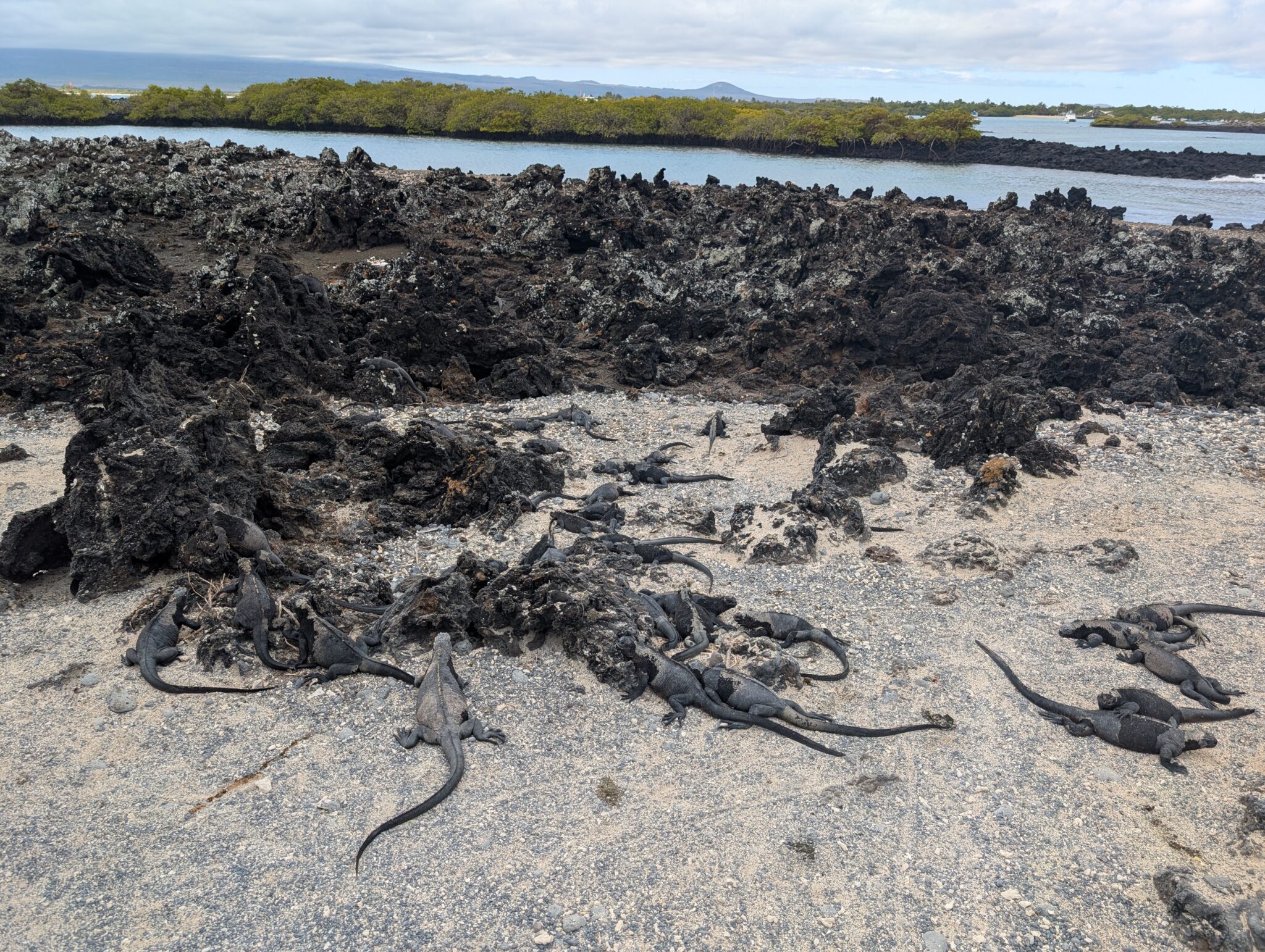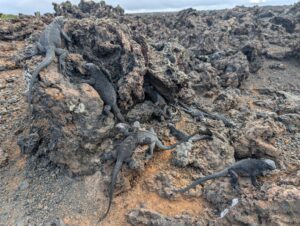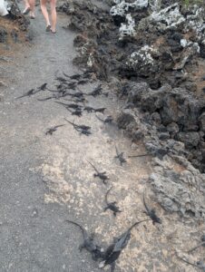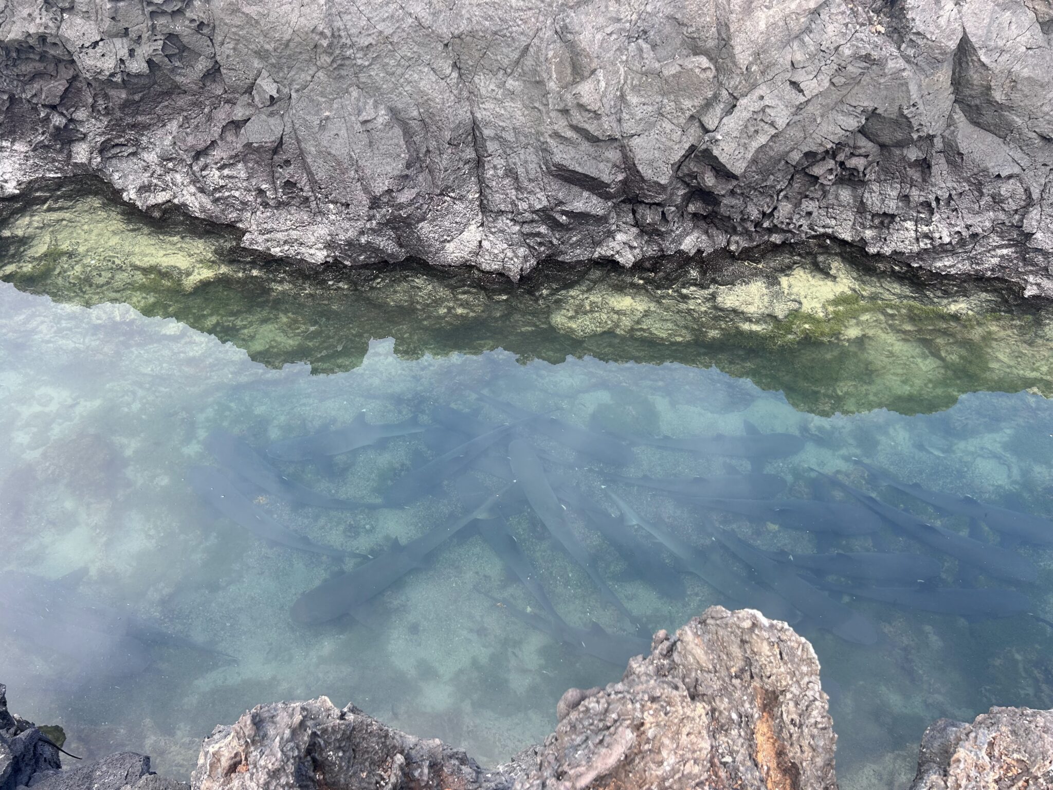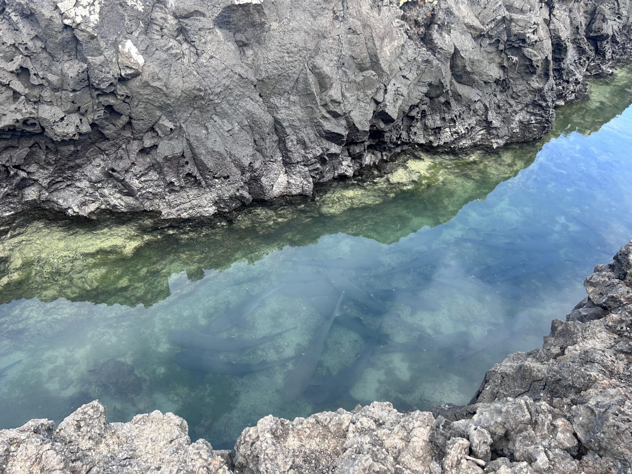 Our final excursion of the trip was a land and snorkeling tour of las tintoreras, which are land formations and canals made from lava flow named for the white-tipped reef sharks who take residence to nap in the canals. Apparently the sharks sleep there for the heat they can feel from the magma below. We had the joy of seeing more blue-footed boobies, eagle rays, and the sole Galápagos penguin residing on Isabela Island at the time we were there. On the land tour, we saw a marine iguana nesting ground and groups of sleeping white tipped reef sharks.