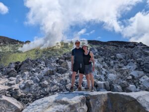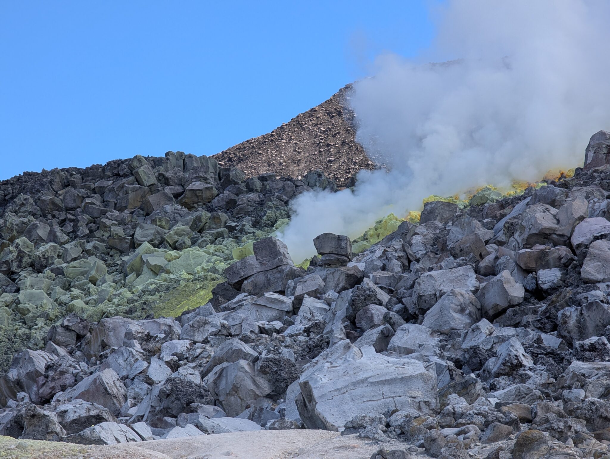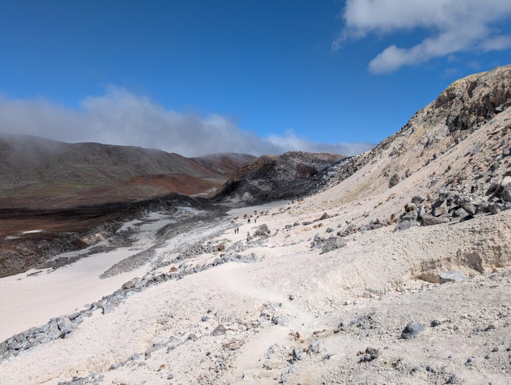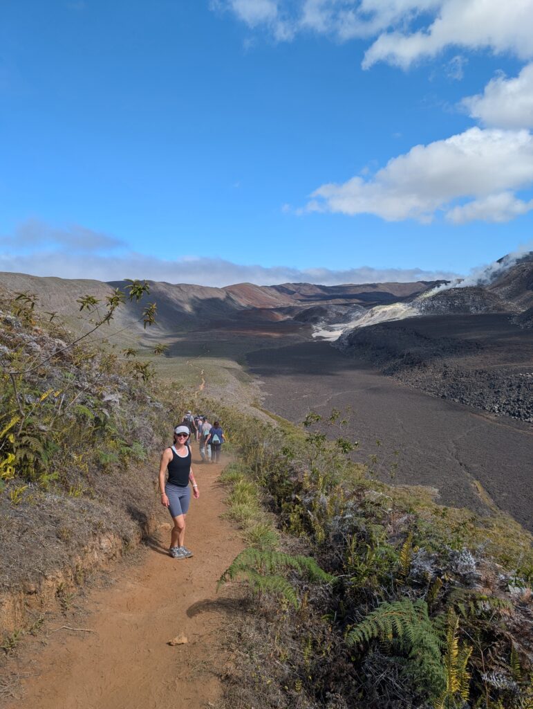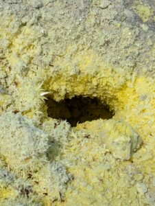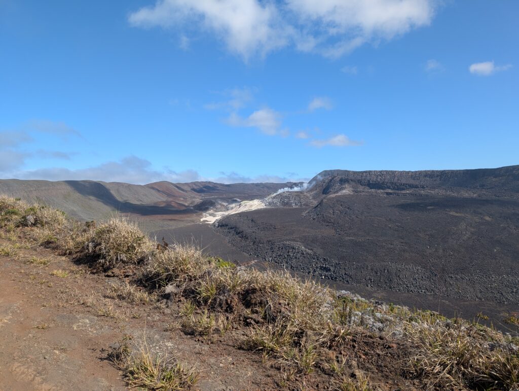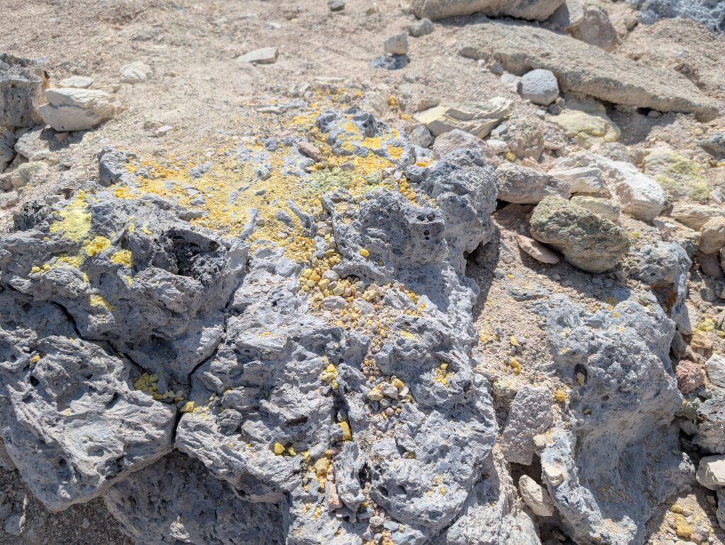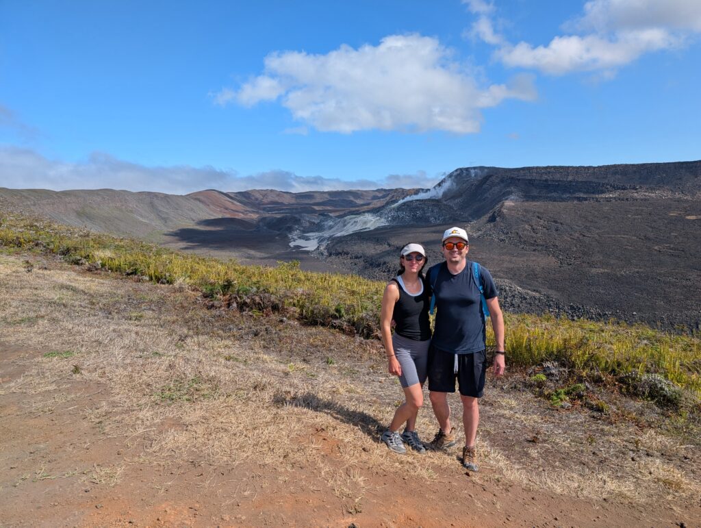 Our final day of excursions started with the shorter hike to the Sierra Negra caldera, which is one of the largest active calderas at nearly 10 km diameter. We walked into the caldera and the sulphur mines, where there were some pockets where you could hold your hand over and feel the heat radiating (surely just fine for our health to be radiated for a second). Inside the vents, it is about 300 degrees Celsius (~575 Fahrenheit). We could also see the sulfur gas coming out of the largest vent (from a safe distance, of course).